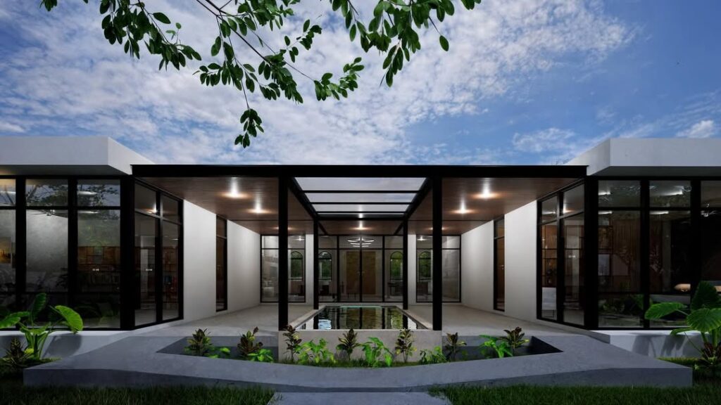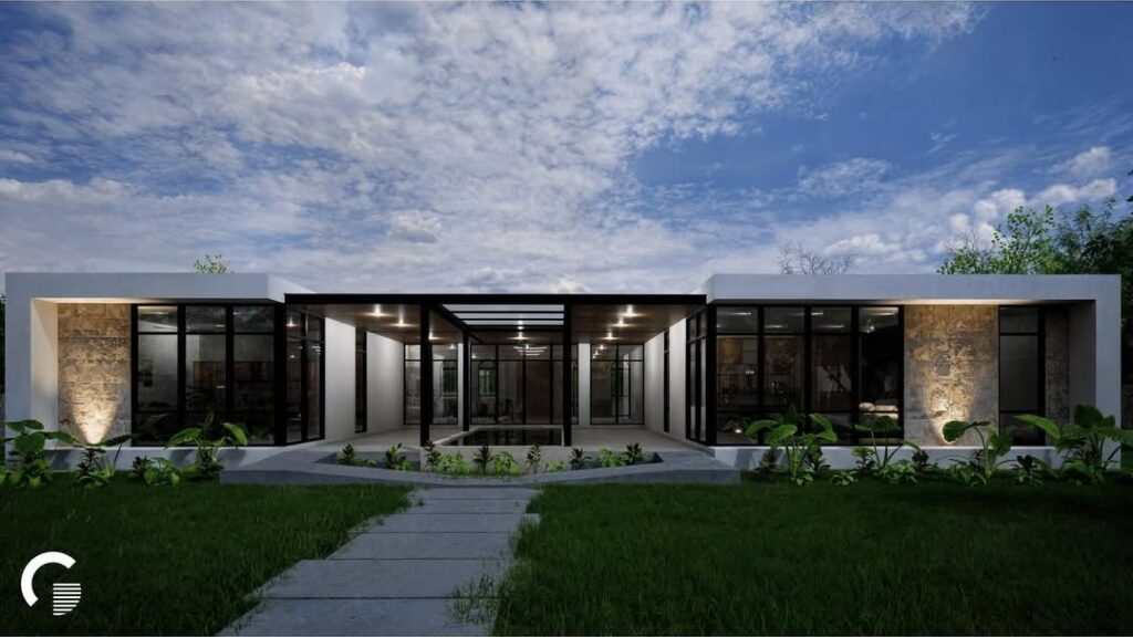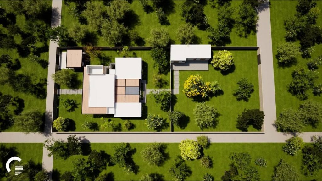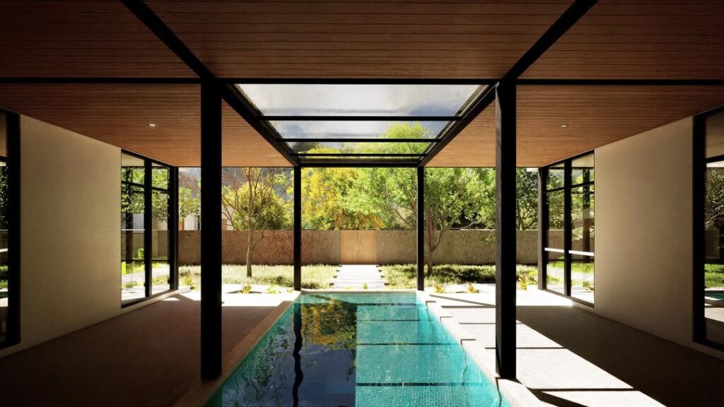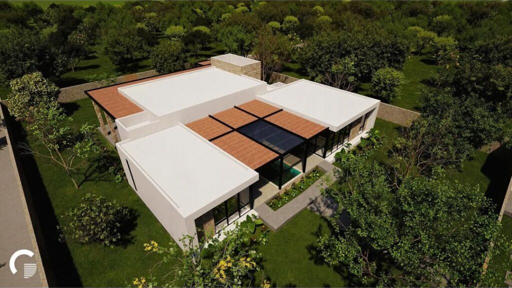 El proyecto se desarrolló en un terreno rectangular de 2660 m², para el cual se planteó una residencia de campo con un esquema de patio central con piscina al interior.