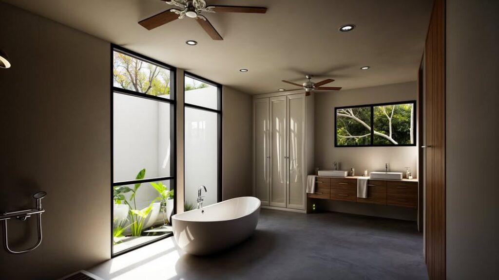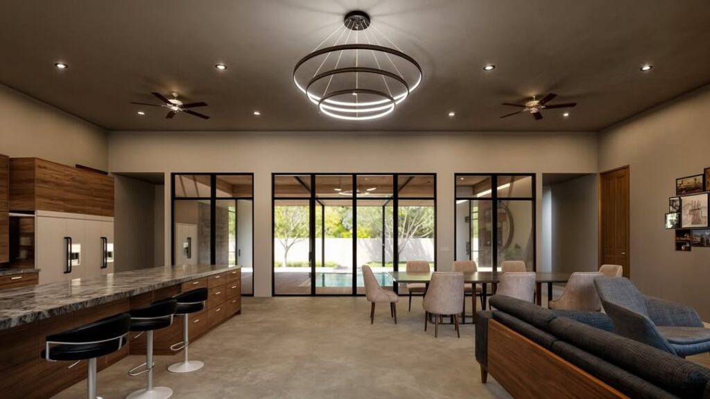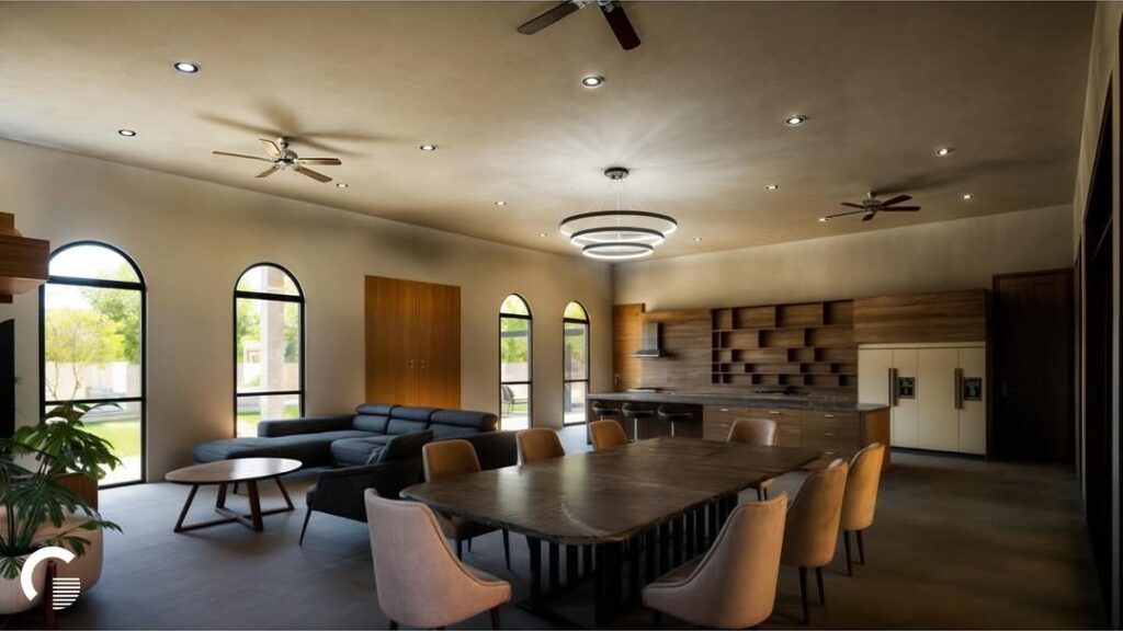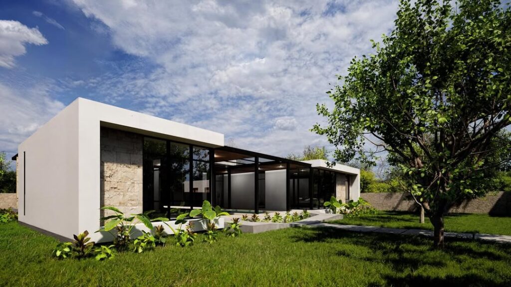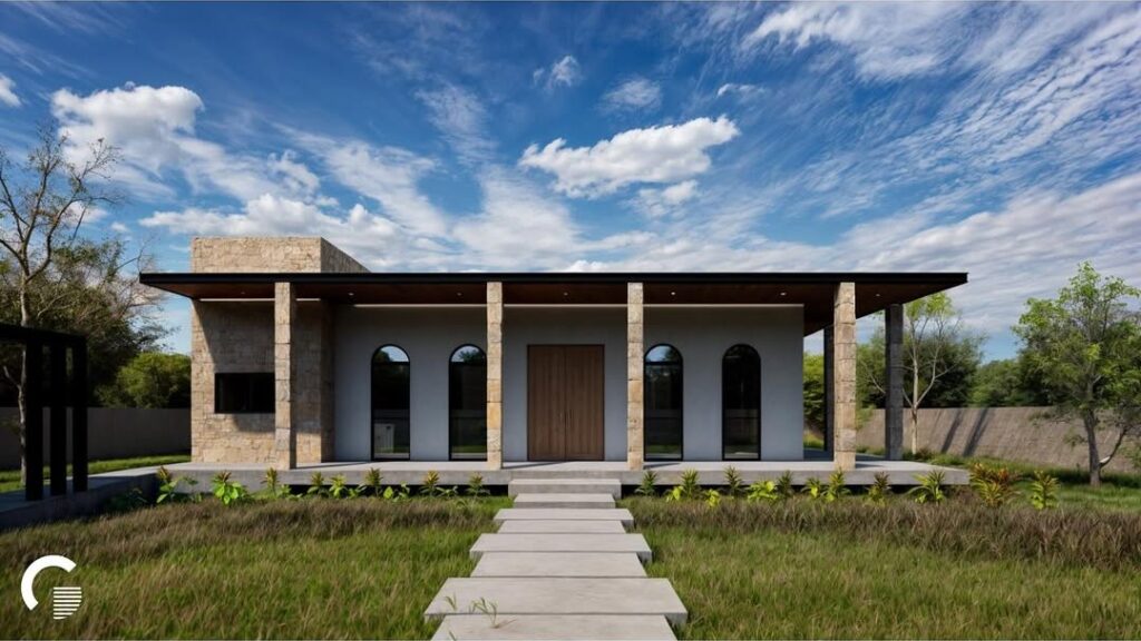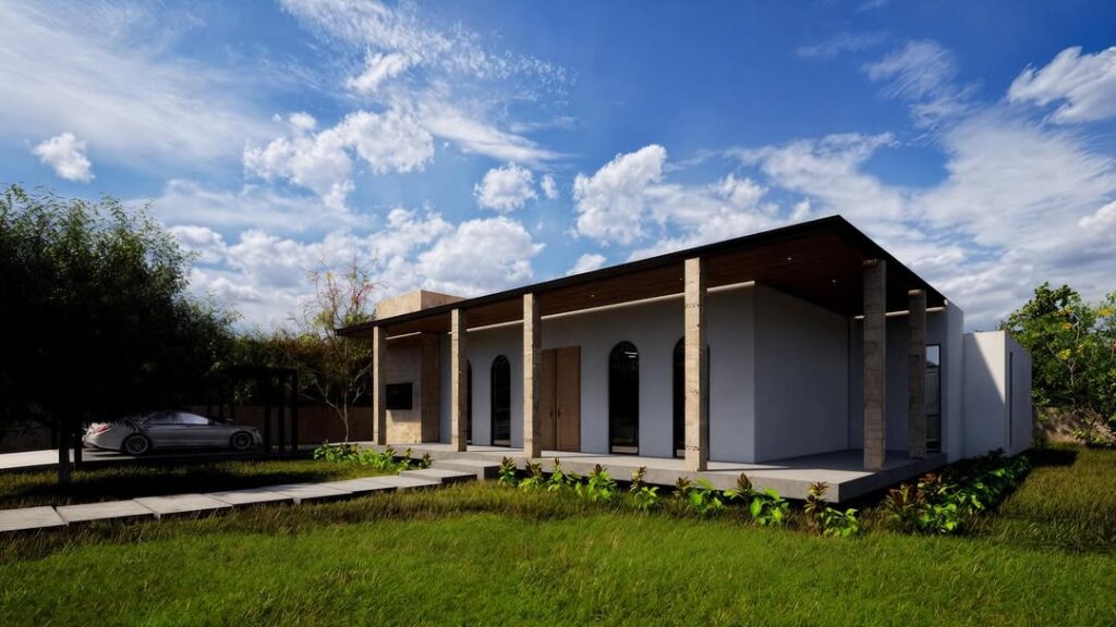 La propuesta presenta materiales de bajo mantenimiento, tales como pisos de concreto pulido, acabados de muro con kimiplaster y pórticos con plafón de fibrocemento y PVC tipo madera.