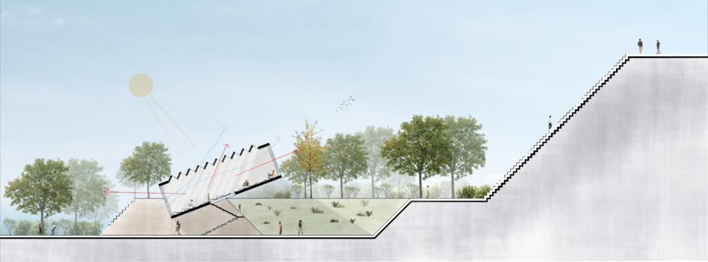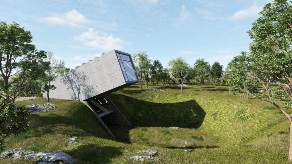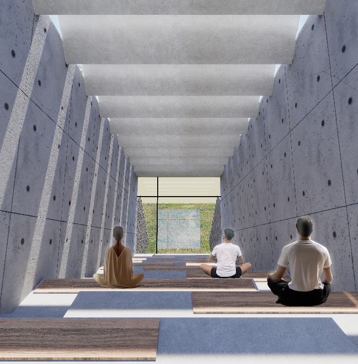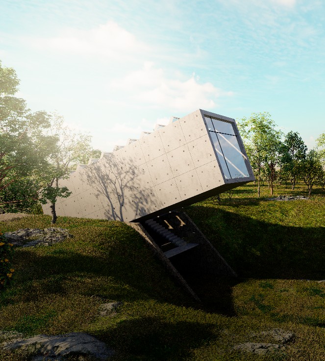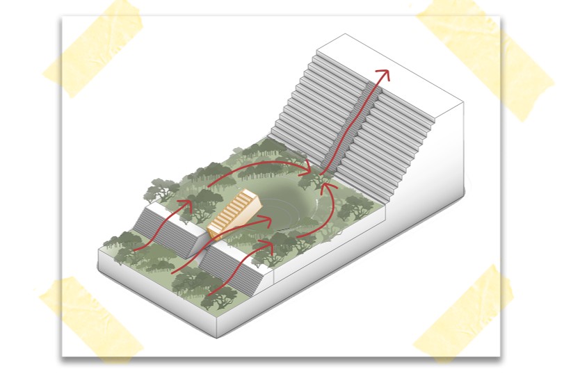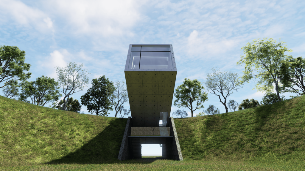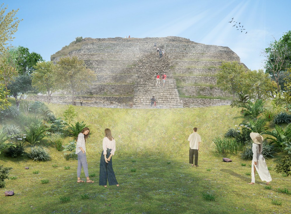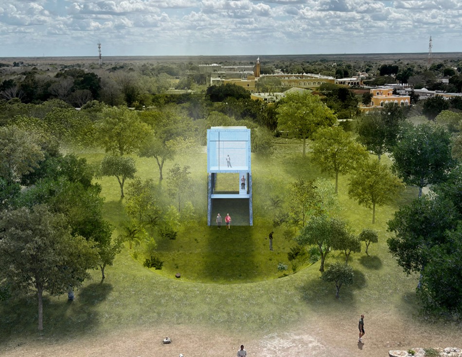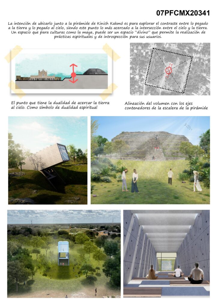 La intención de ubicarlo junto a la pirámide de Kinich Kakmó es para explorar el contraste entre lo pegado a la tierra y lo pegado al cielo, siendo este punto lo más acercado a la intersección entre el cielo y la tierra. Un espacio que para culturas como la maya, puede ser un espacio “divino” que permite la realización de prácticas espirituales y de introspección para sus usuarios.