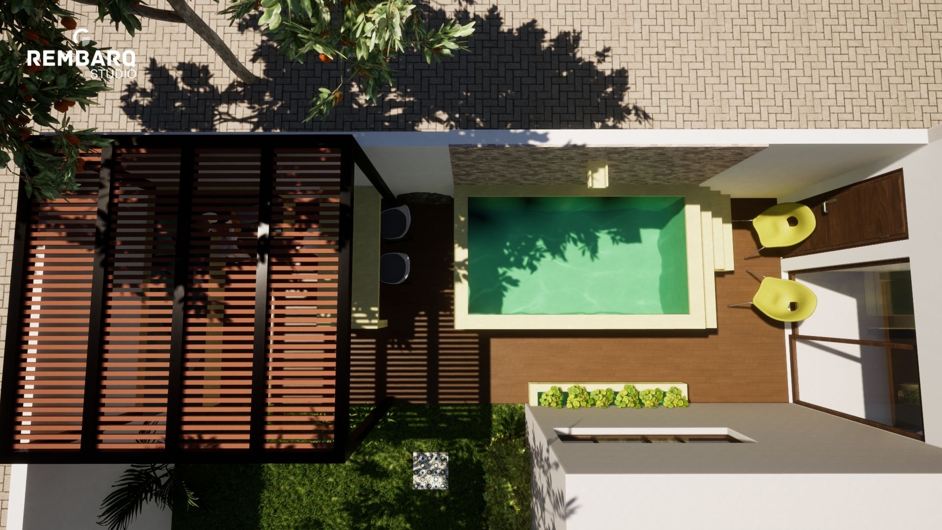 Este proyecto representa una intervención para revitalizar un espacio exterior de 8.8 x 3.0 metros dentro de una residencia y brindarle una nueva atmósfera de convivencia. El conjunto está compuesto por una piscina de 3.8 x 1.9 metros y una pérgola de 3.0 x 3.1 metros con estructura de acero y cubierta por cañas de bambú que logran dar sombra a una sala y un comedor exteriores de concreto con vistas hacia un amplio jardín.